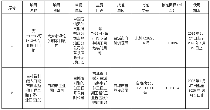 根据《自然资源部关于规范临时用地管理的通知》(自然资规〔2021〕2号、《自然资源部办公厅关于临时用地信息填报有关工作的通知》(自然资办函〔2022〕285号)等相关文件精神,以下临时用地项目已经白城市自然资源局批准,现对结果进行公示。